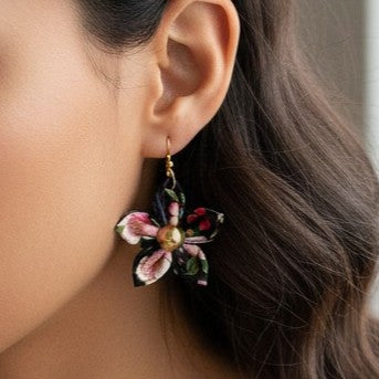 La fleur dans tous ses états : des boucles d'oreilles, broches, élastiques et barrettes ornés de fleurs en tissu japonais et cousues à la main, complètent la gamme sacs et accessoires.