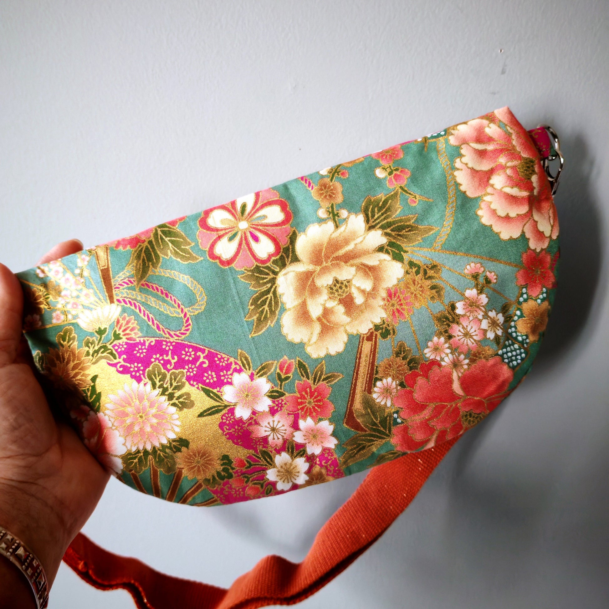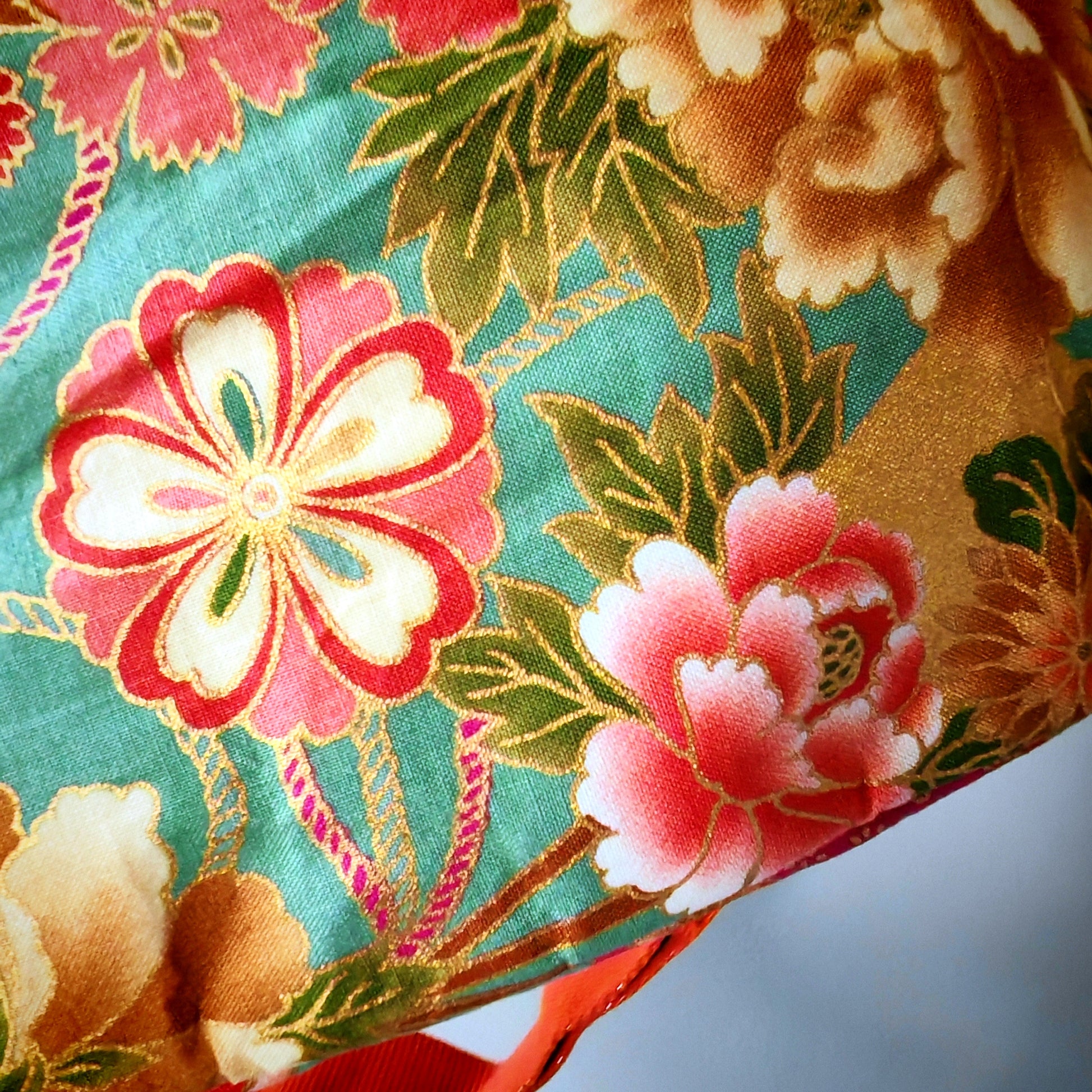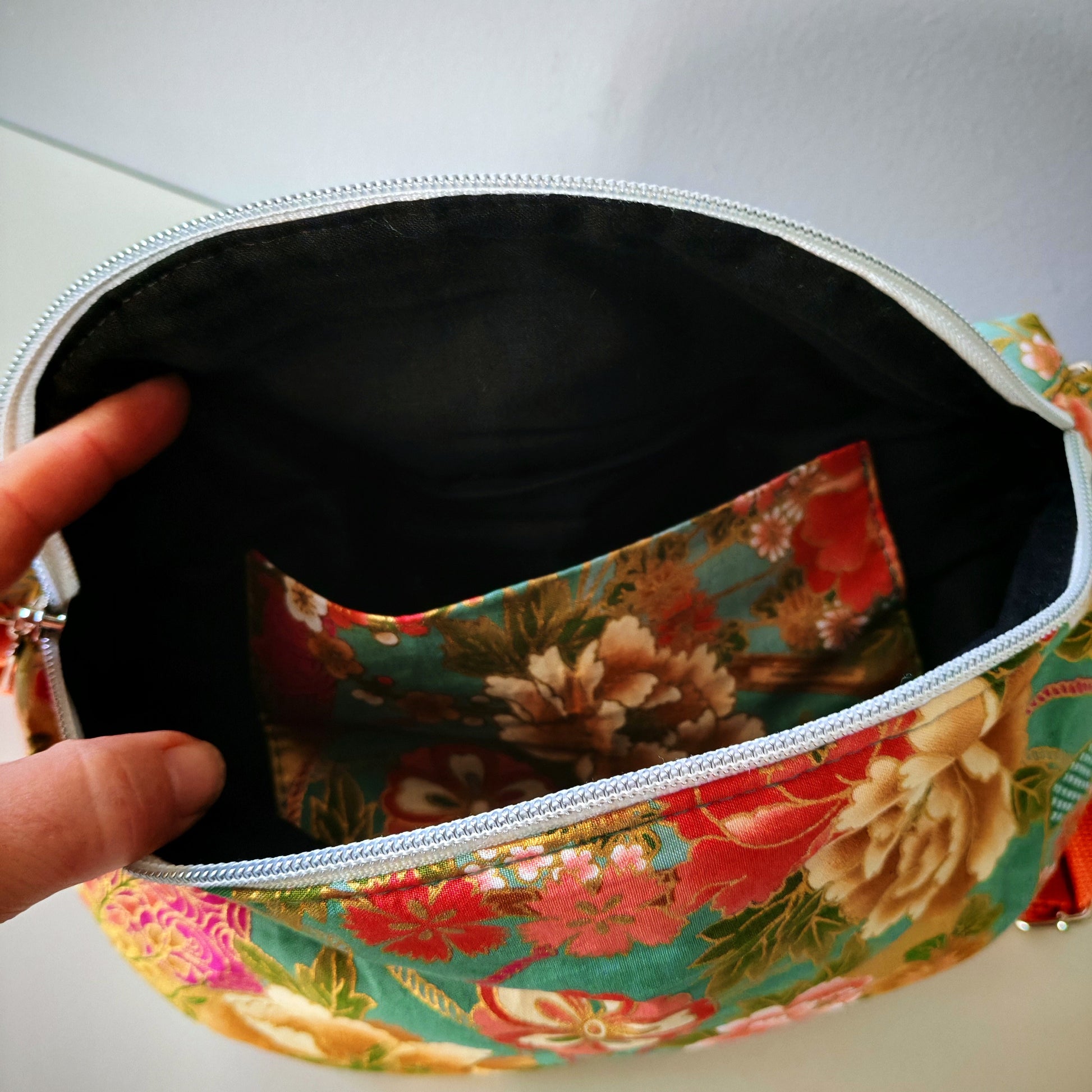 L'extérieur est entièrement cousu avec des tissus japonais brillants aux nombreux motifs. L'intérieur est doublé et possède une grande poche plaquée cousue dans le tissu extérieur.