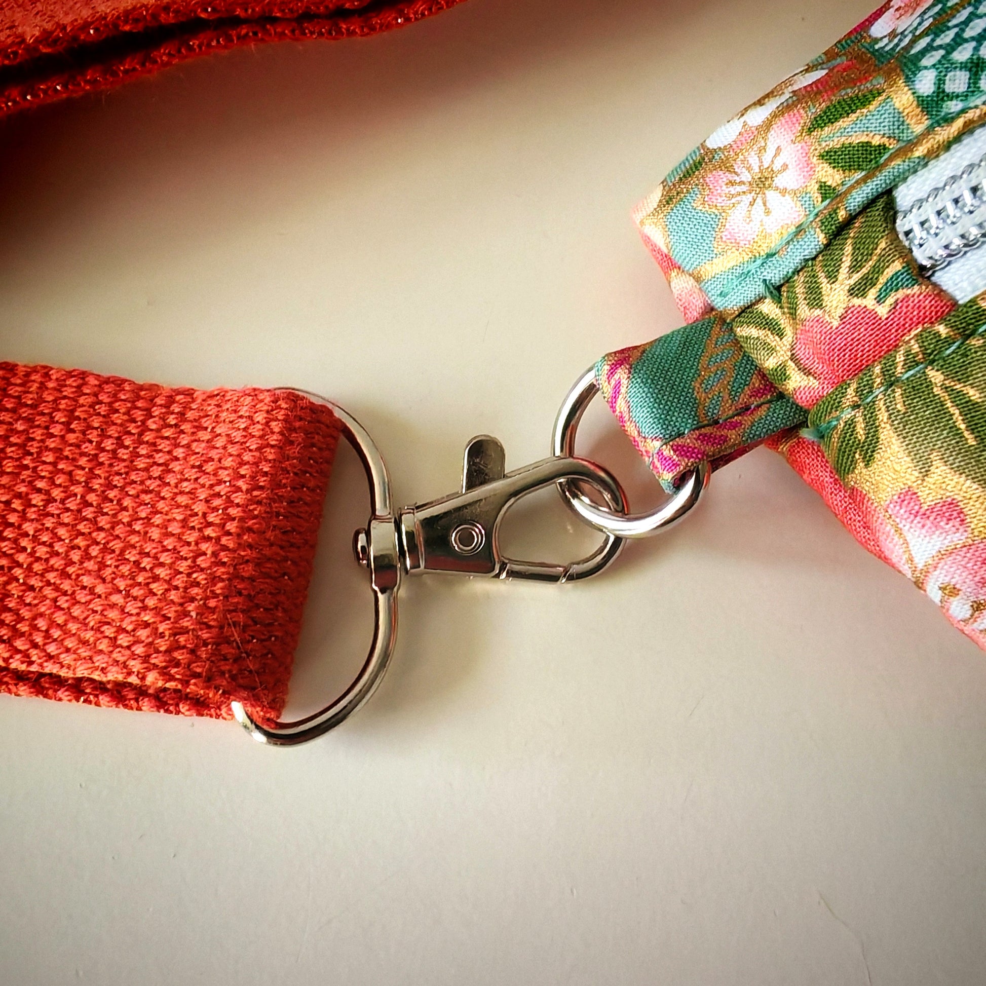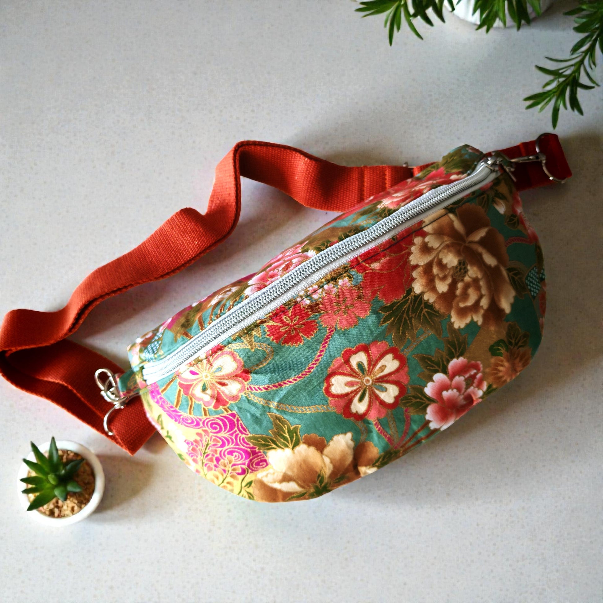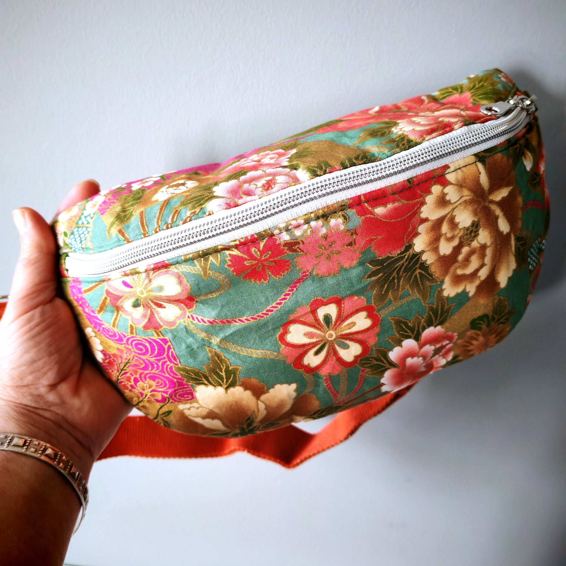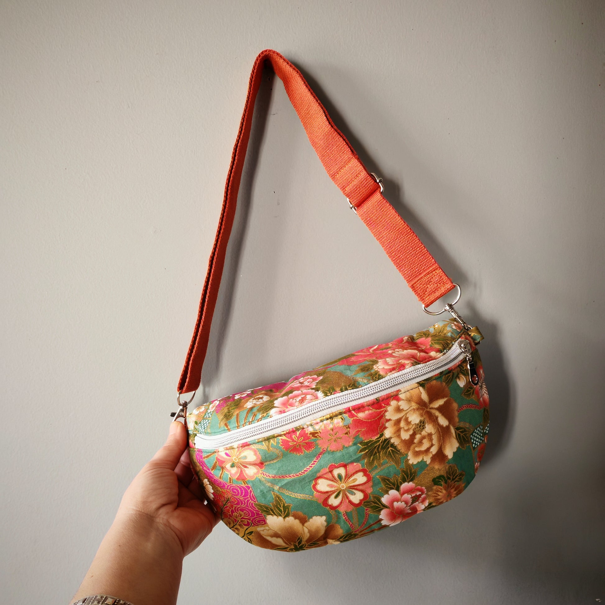 L'extérieur est entièrement cousu avec des tissus japonais brillants aux nombreux motifs. L'intérieur est doublé et possède une grande poche plaquée cousue dans le tissu extérieur.