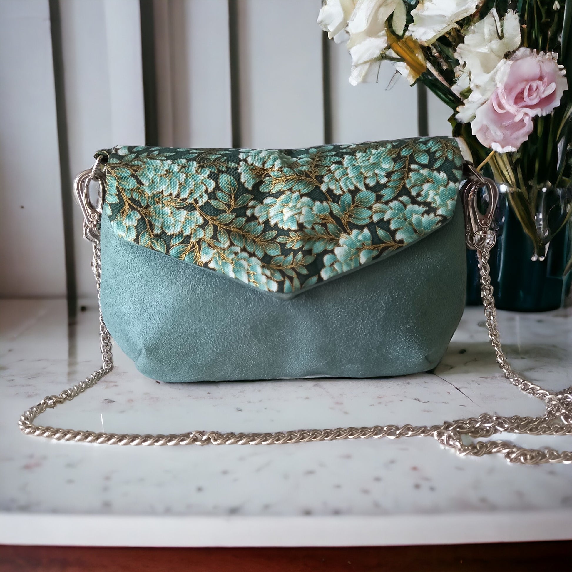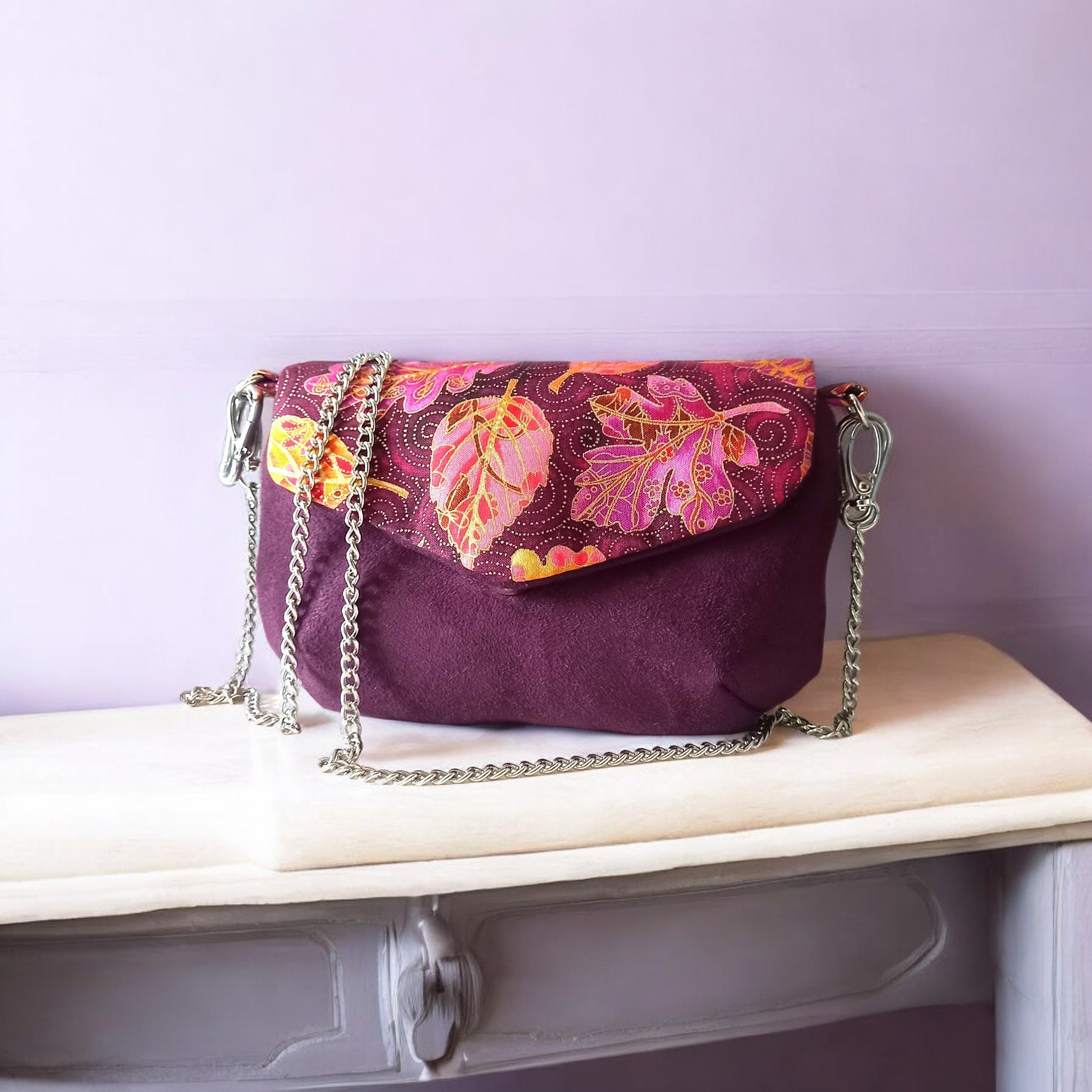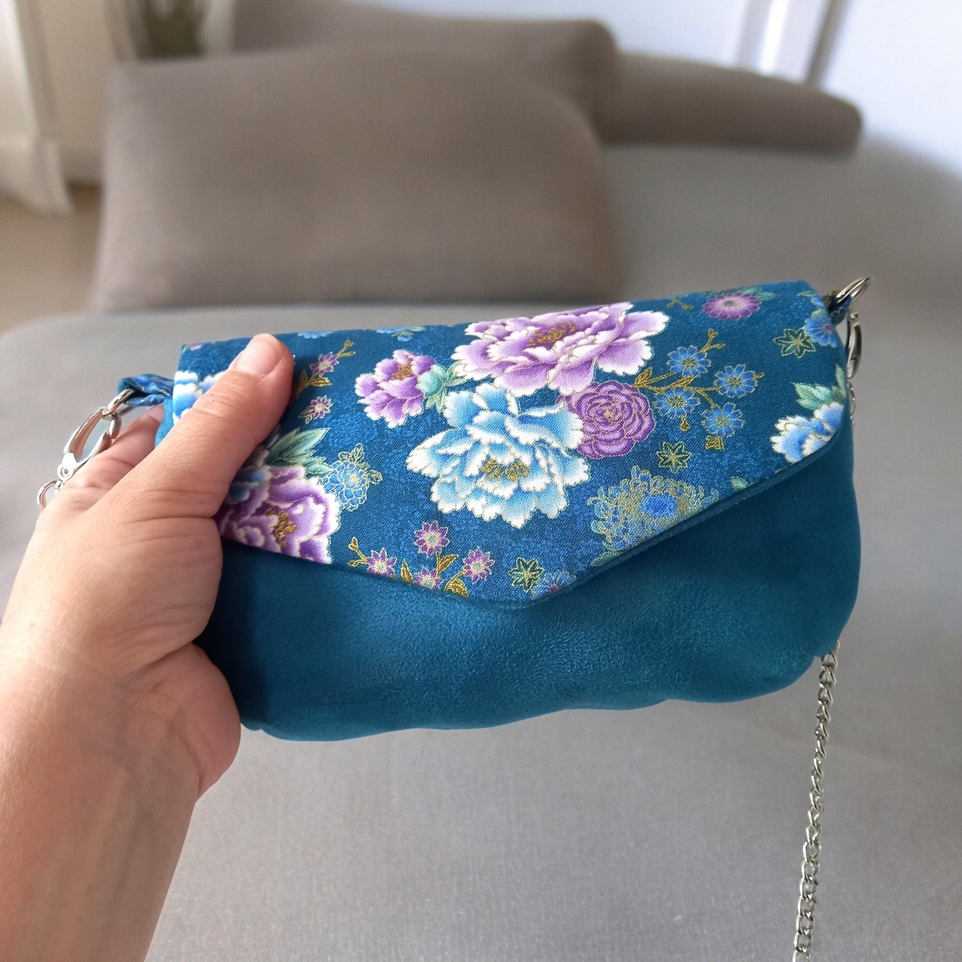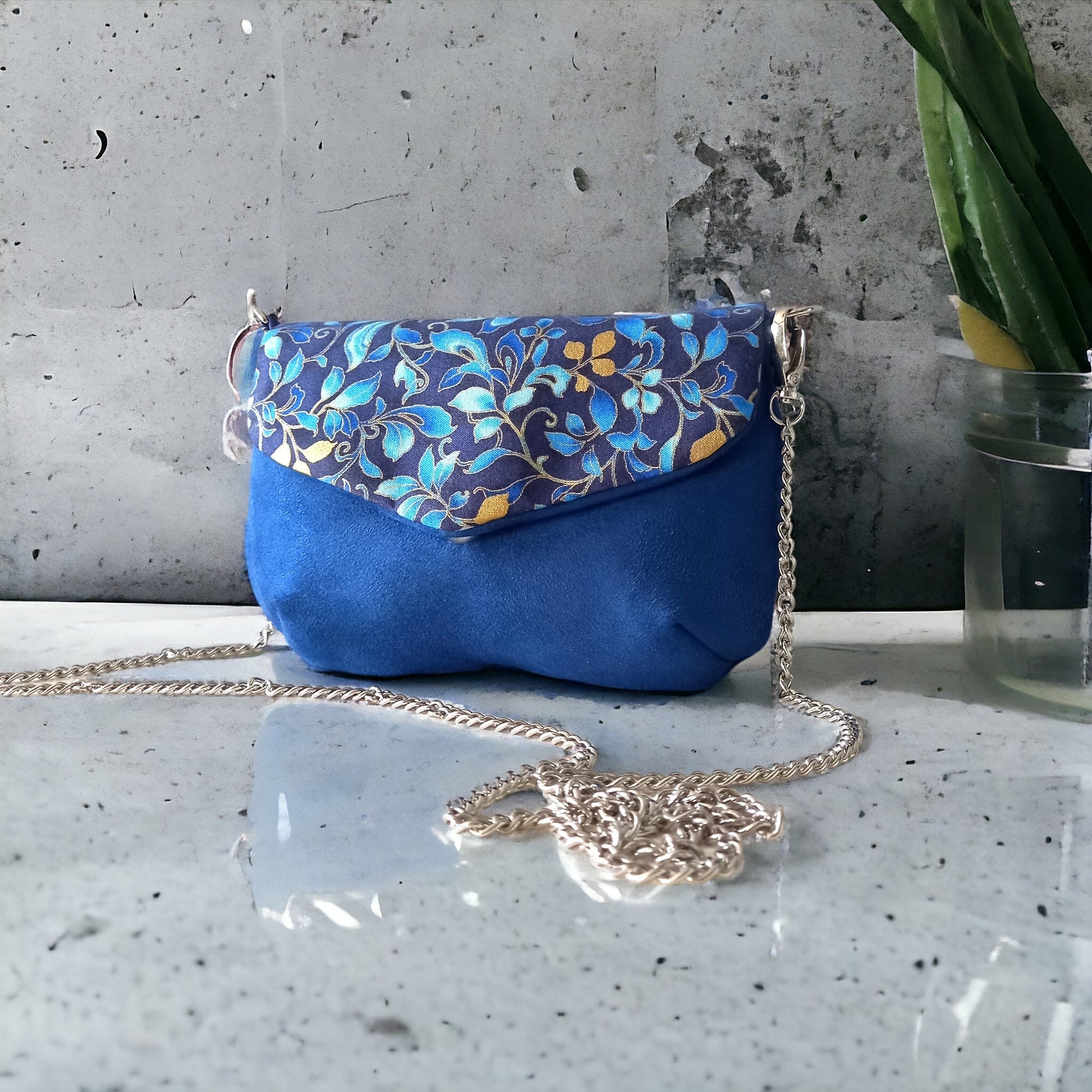 C'est un petit sac fin et raffiné, en base de suédine et tissu japonais sur le rabat. Elle ferme avec un bouton aimanté.