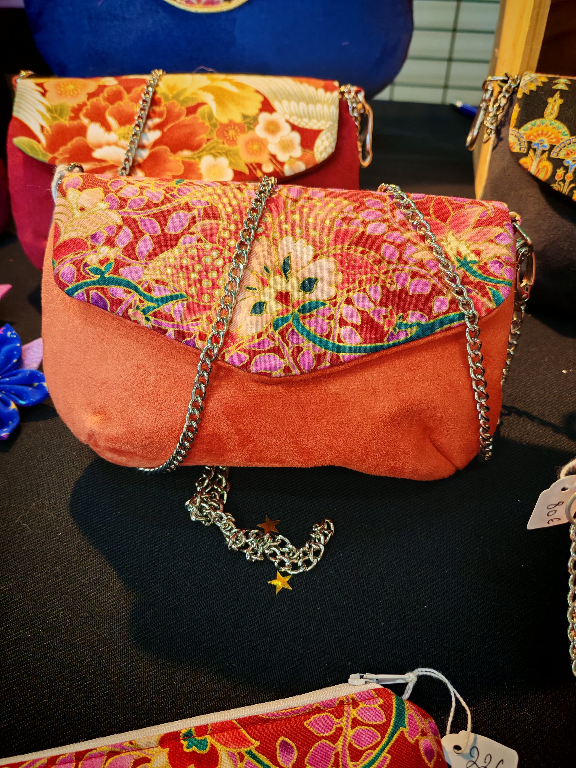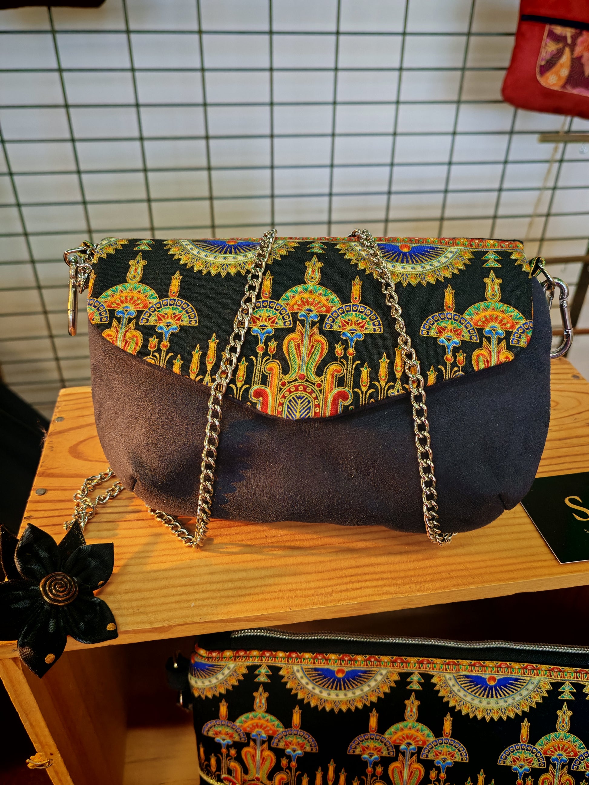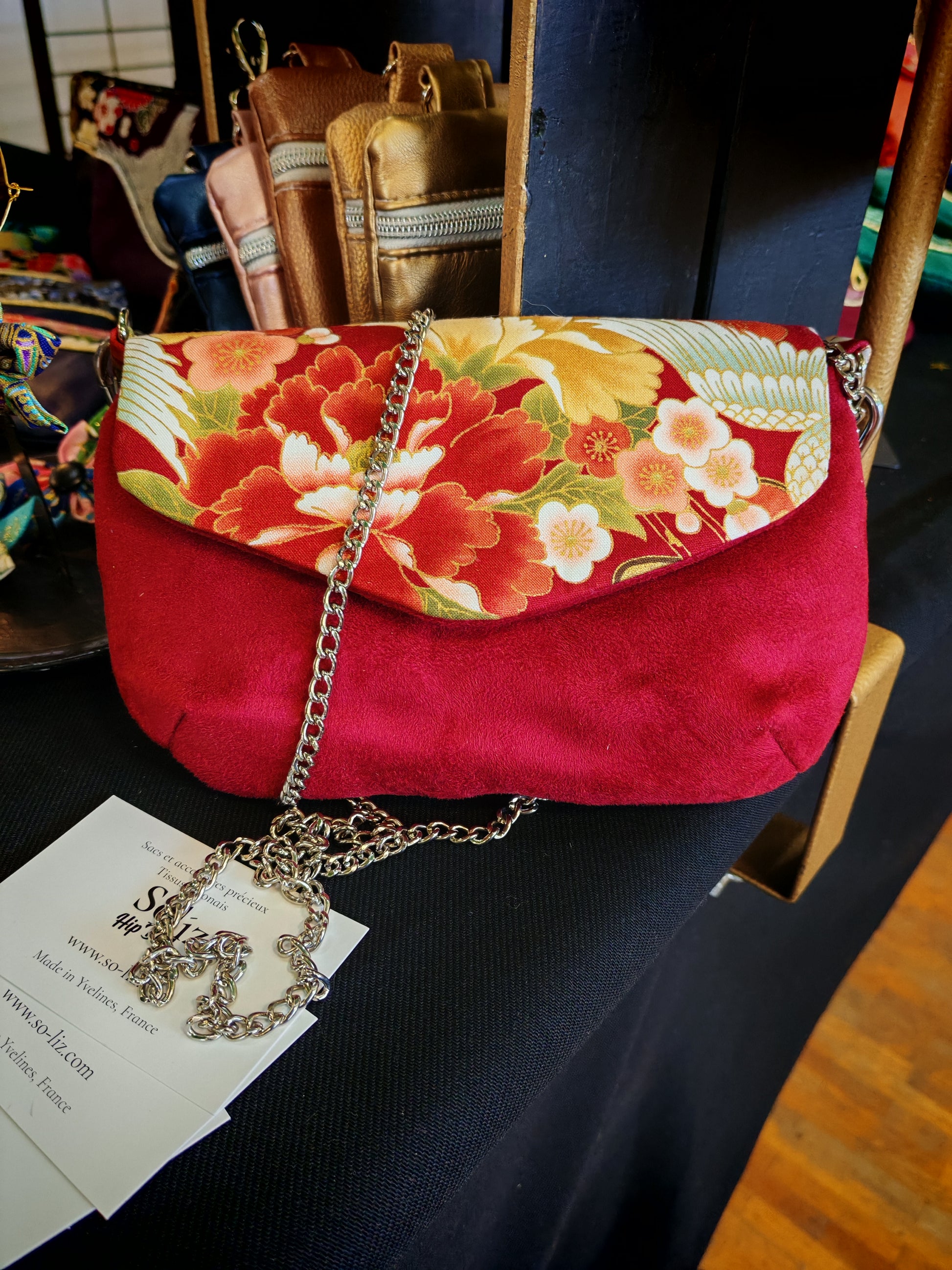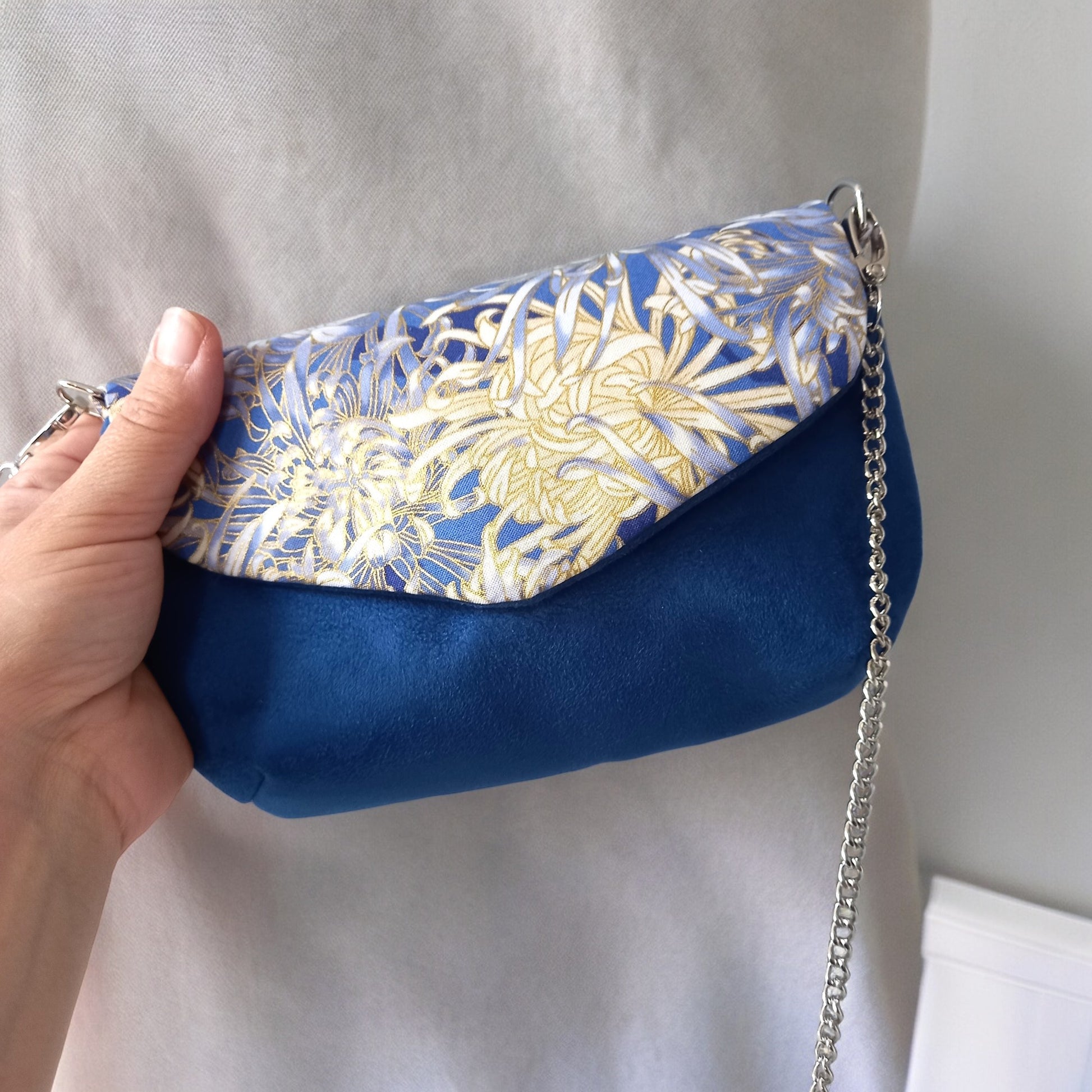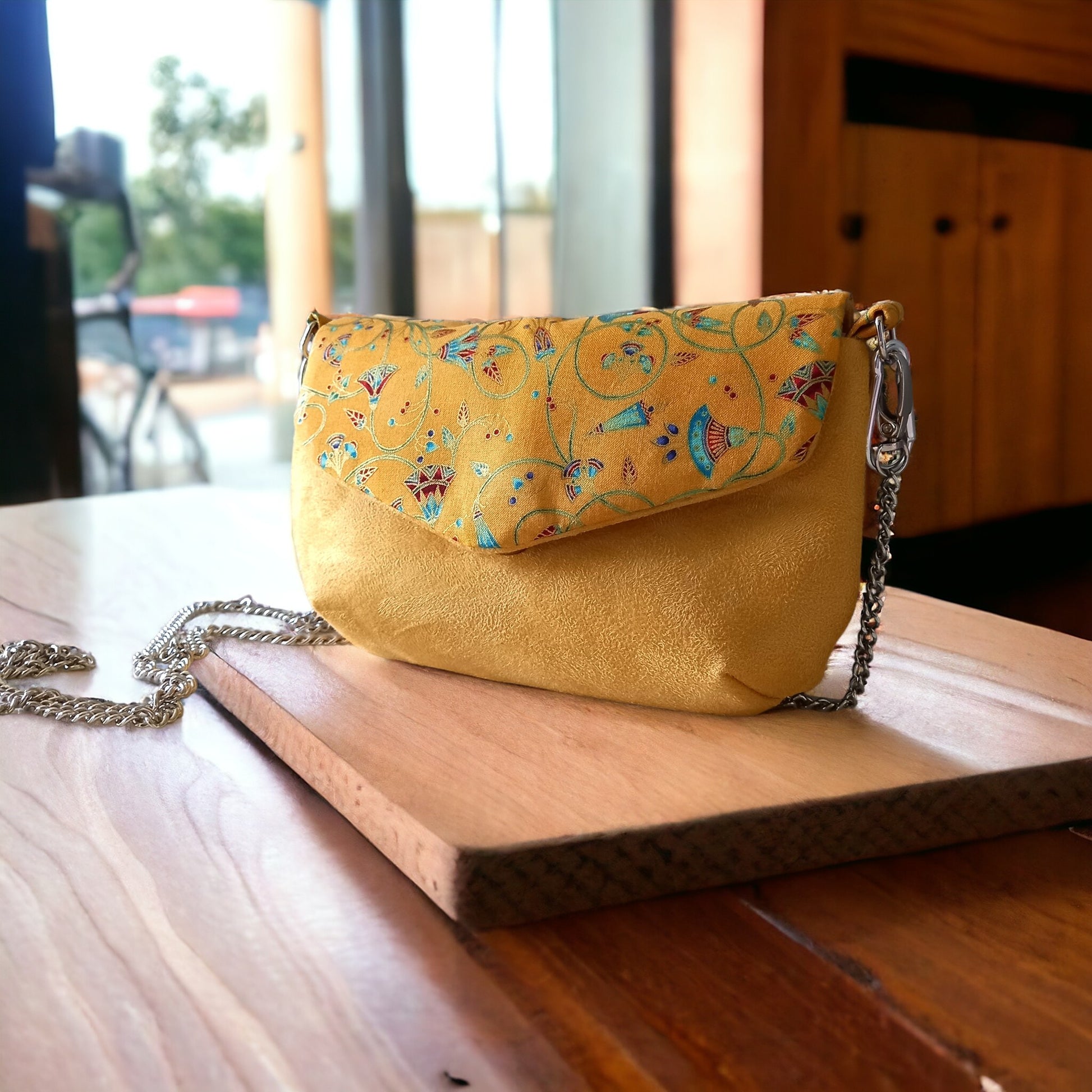 C'est un petit sac fin et raffiné, en base de suédine et tissu japonais sur le rabat. Elle ferme avec un bouton aimanté.