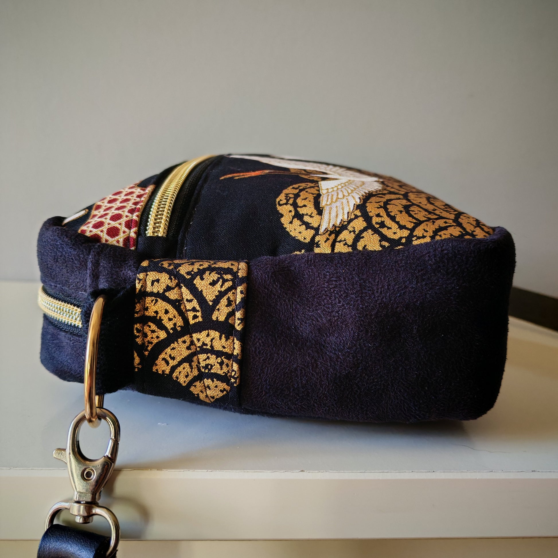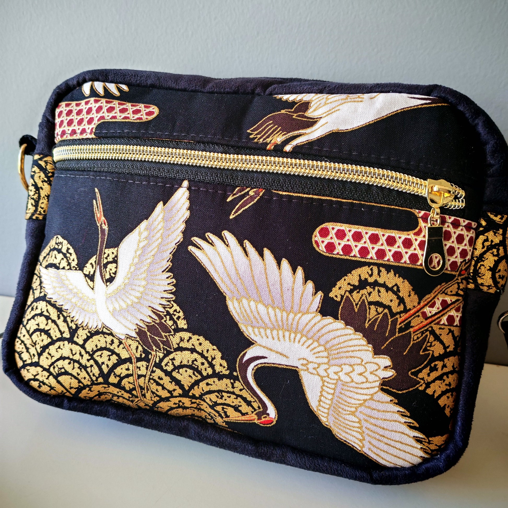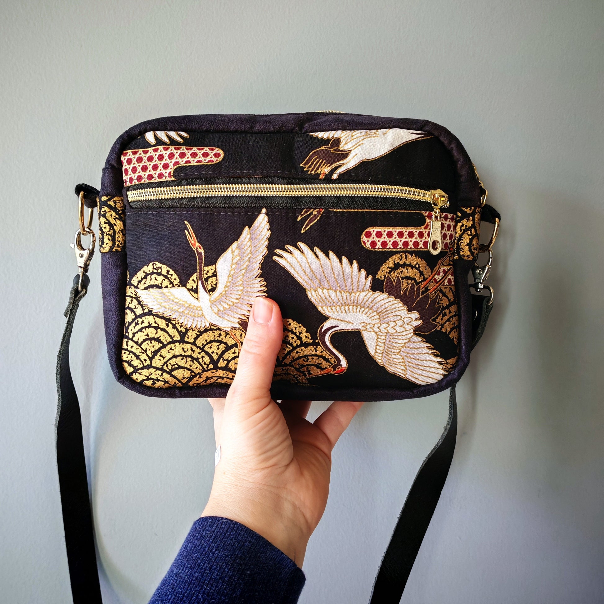 Sac en suédine noire et tissu japonais doré avec grues et nuages.