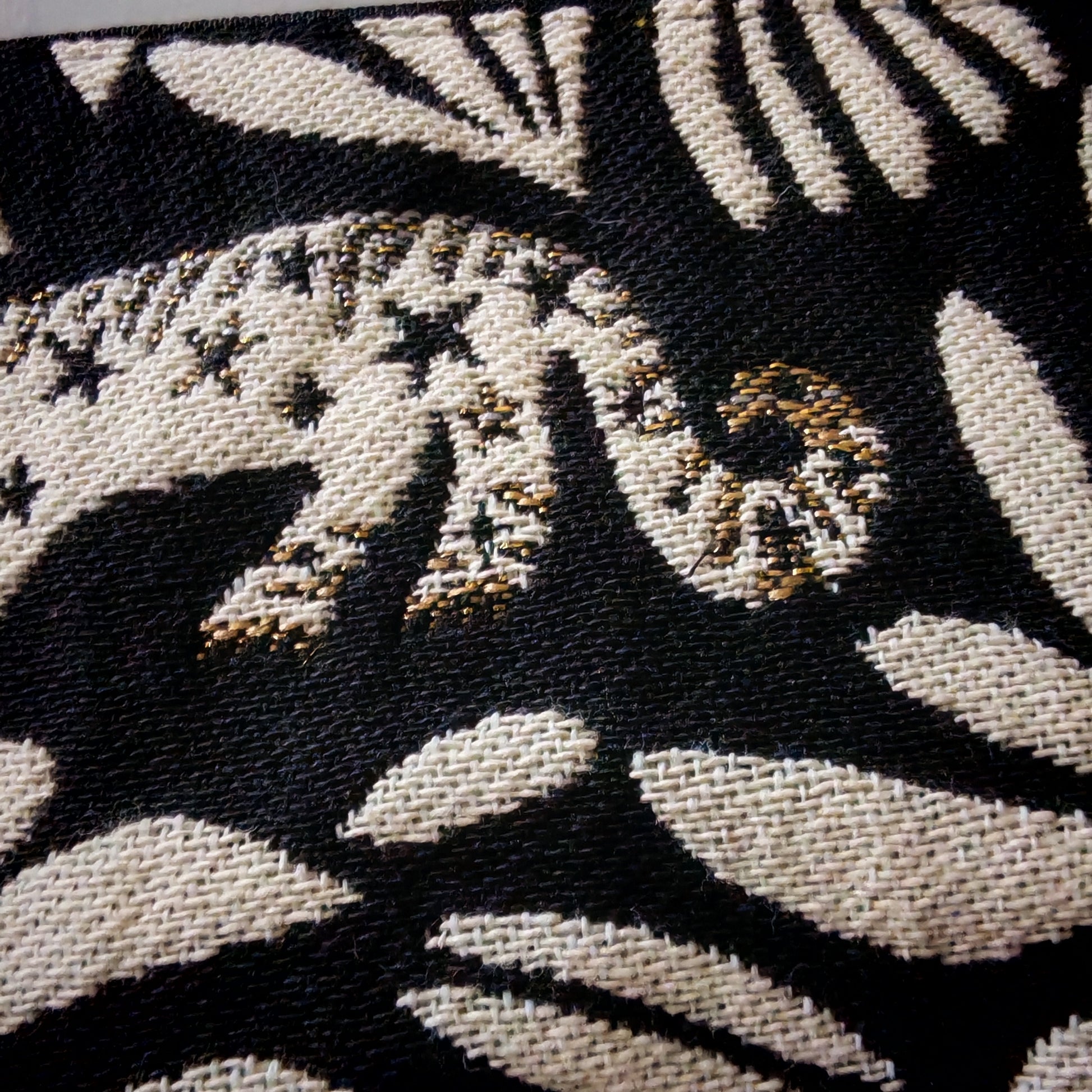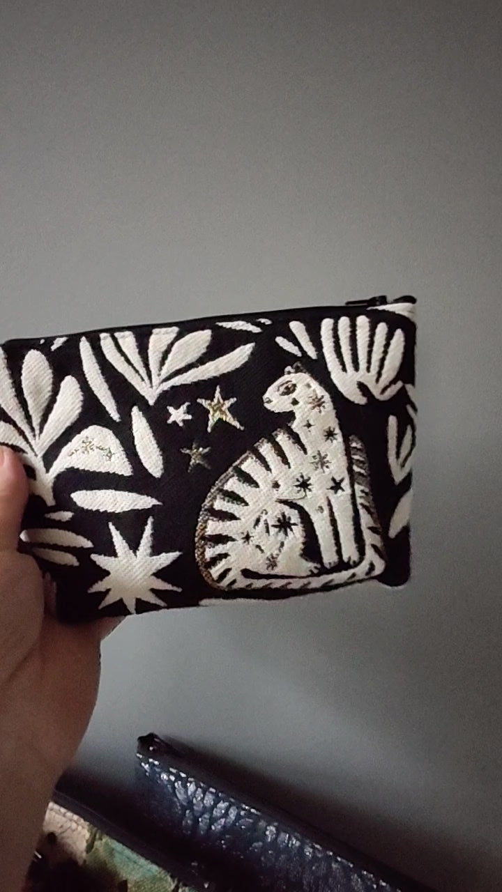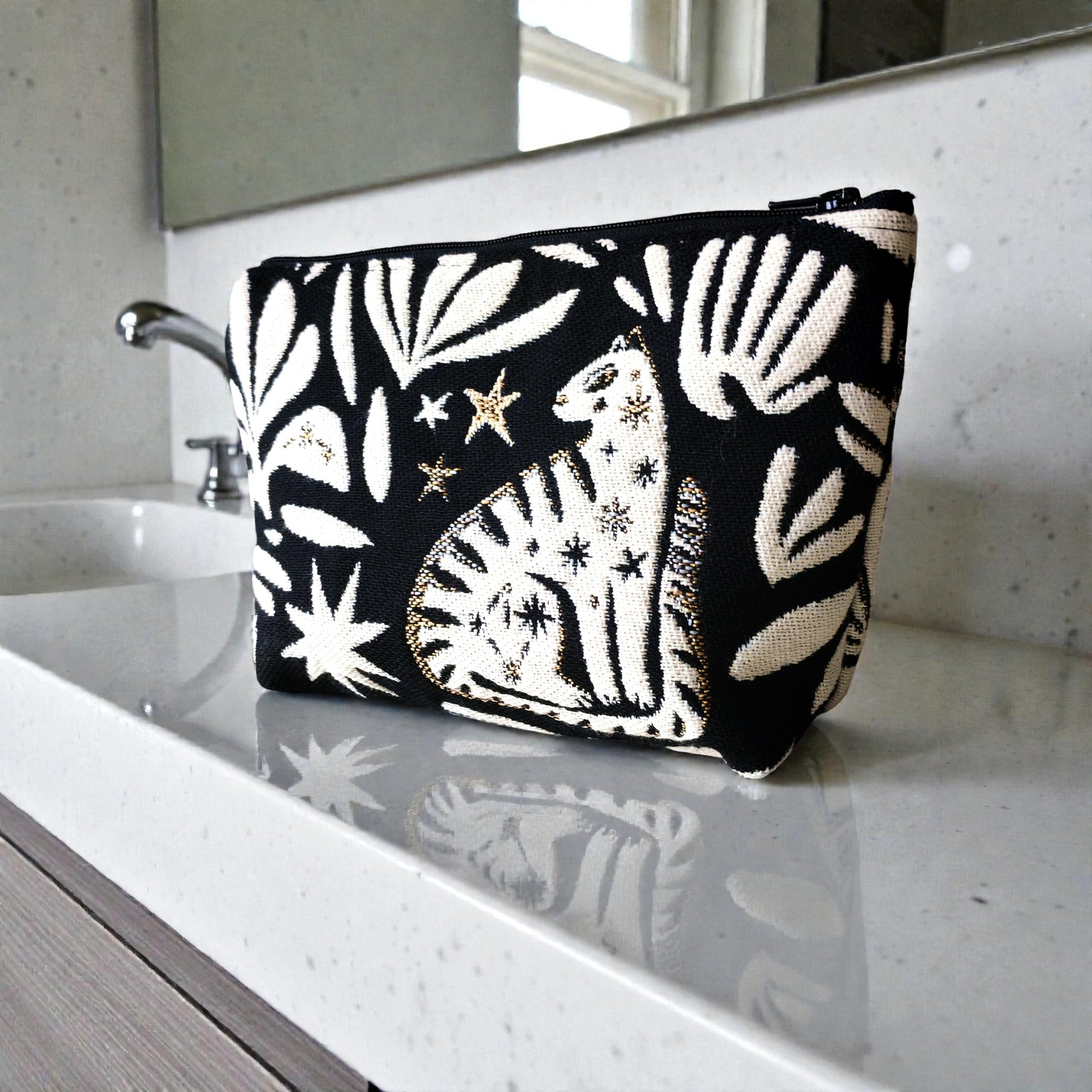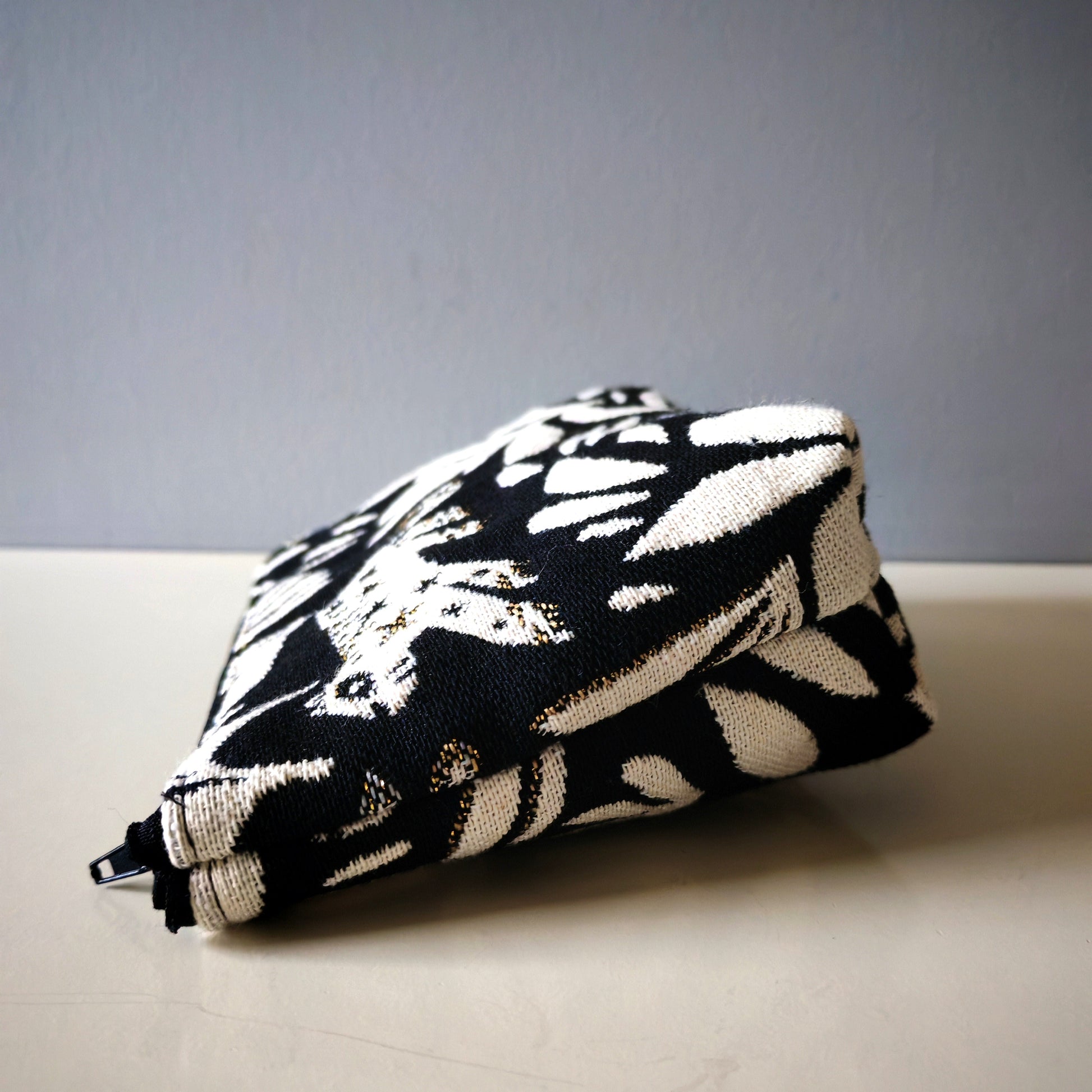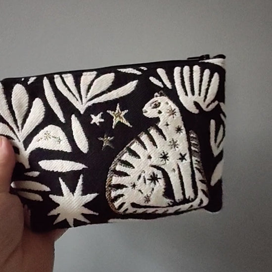 Trousse confectionnée dans un jacquard noir et blanc, avec motifs félins et coeurs tissés d'un fil lurex doré.