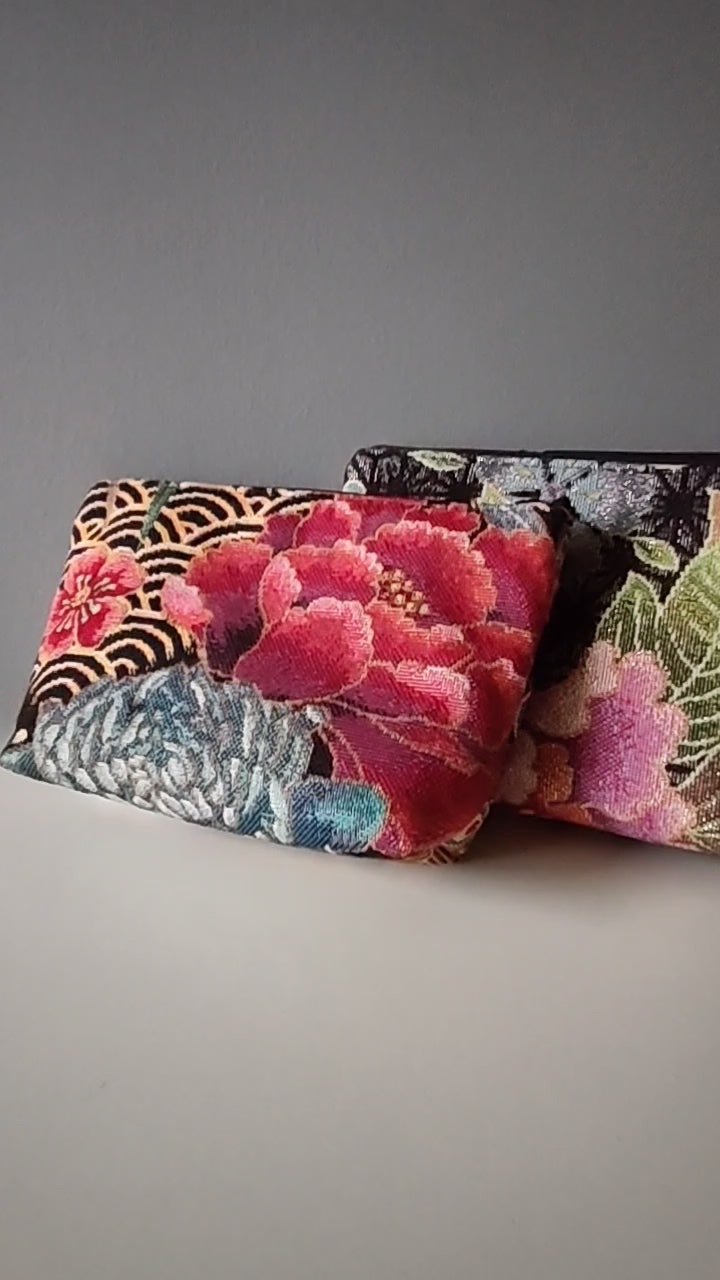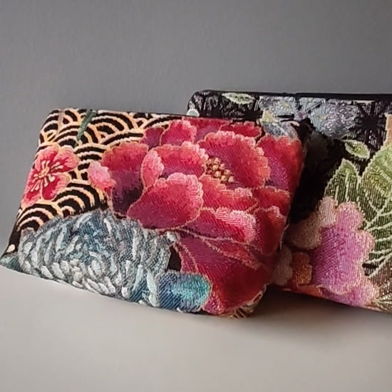 Trousse confectionnée dans un jacquard français au style japonisant, multicolore, avec fleurs, et motifs asanoha.